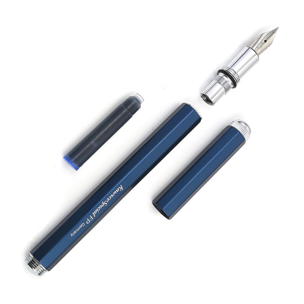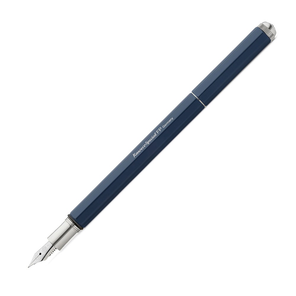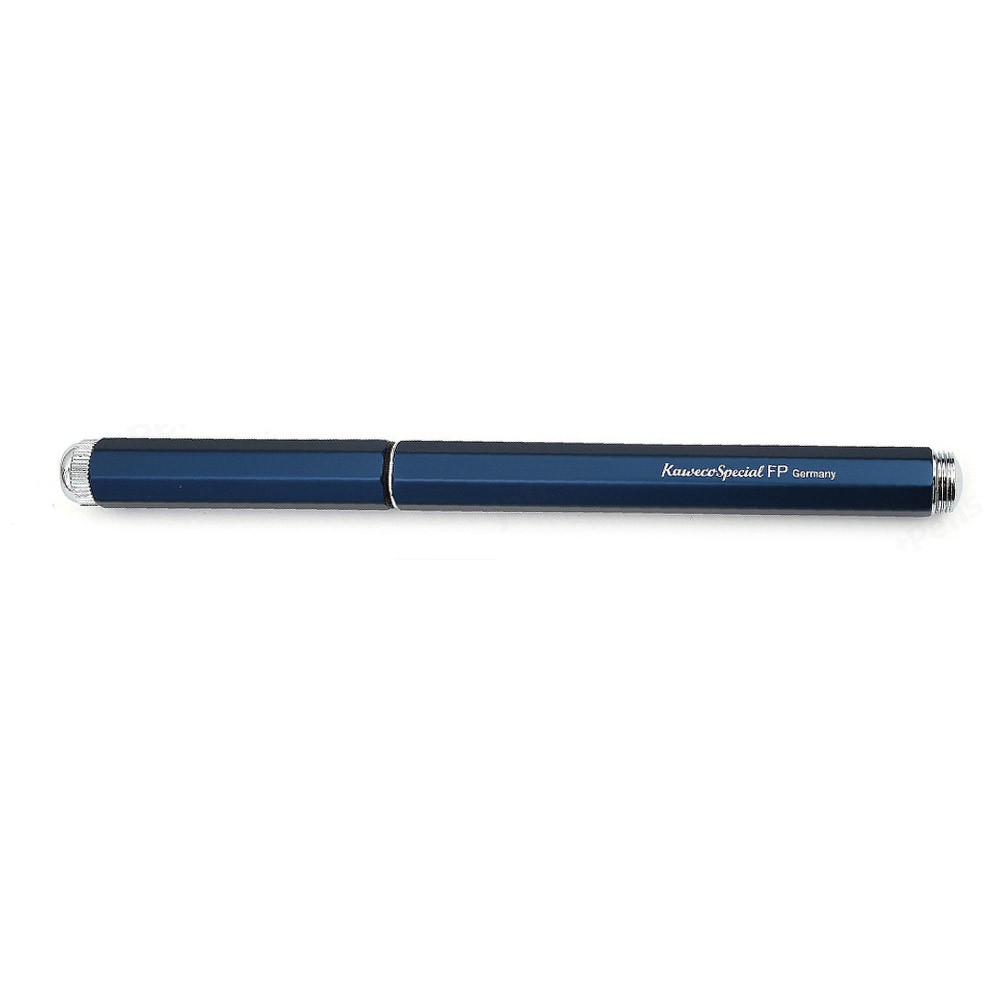 Инструменты серии Special от Kaweco отличает тонкий восьмигранный корпус. Диаметр ручки в самом широком месте - 1см. Ручки Special Blue Edition произведены из литого анодированного алюминия с хромированными элементами. Перо - гравированное, серебристое, сделано из нержавеющей стали. Гравировка на корпусе - серебристого цвета. Металлический логотип на колпачке - также серебристый. Колпачок на резьбе надёжно защищает ручку. В сложенном состоянии длина ручки составляет 14,2 см. Инструмент выглядит монолитно и солидно. В открытом состоянии ручка имеет длину 16,8 см, обеспечивая отличный баланс. Ручка идёт в комплекте с одним синим картриджем. В ручках Special можно использовать картриджи International Long, International Short, а также конвертер Kaweco. К ручке Special можно отдельно приобрести клип. ВАЖНО: от долгого контакта с чернилами металлические элементы ручки могут начать ржаветь. Не погружайте ручку в чернила и после работы удостоверьтесь, что на ручке не осталось чернил.