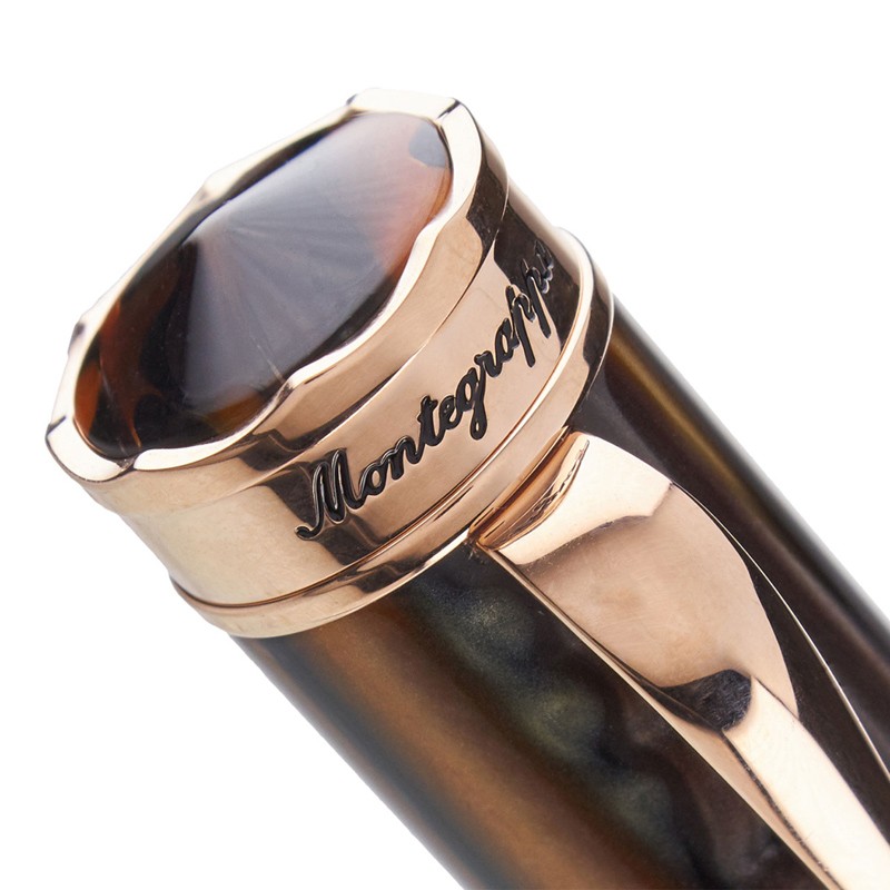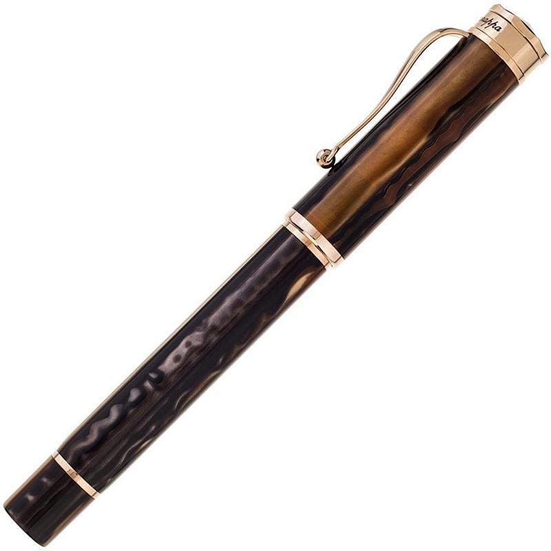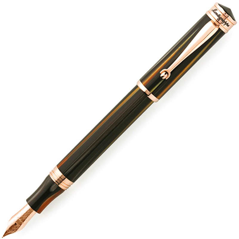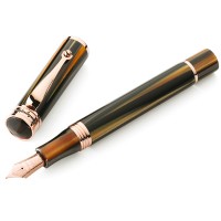 Перьевая ручка "Дукале" коричнево-золотого цвета от итальянской компании "Montegrappa" относится к серии "Ducale", получившей свое название в честь Palazzo Ducale - Дворца Дожей в Венеции. Именно облик венецианских зданий подсказал когда-то, в далёкие 1930-е годы, форму ручек "Ducale". Сегодня старая форма заиграла новыми оттенками, подчеркивающими связь с этим старинным, богатым и величественным городом. Корпус данной модели шариковой ручки "Ducale" выполнен из коричневой акриловой смолы с золотым отблеском. Отделка - стальная с покрытием из розового золота. Перо ручки сделано из позолоченной стали. На нём выгравирован тонкий фирменный орнамент "Montegrappa". Колпачок - закручивающийся. Заправлять ручку чернилами можно с помощью конвертера или посредством картриджей. Размеры ручки - довольно солидные, и потому она будет отлично смотреться в крупной руке. Ручка станет прекрасным подарком не только для больших и значительных людей, но и для всех, кто покорен красотой Венеции, или восхищен историей легендарной торговой республики.