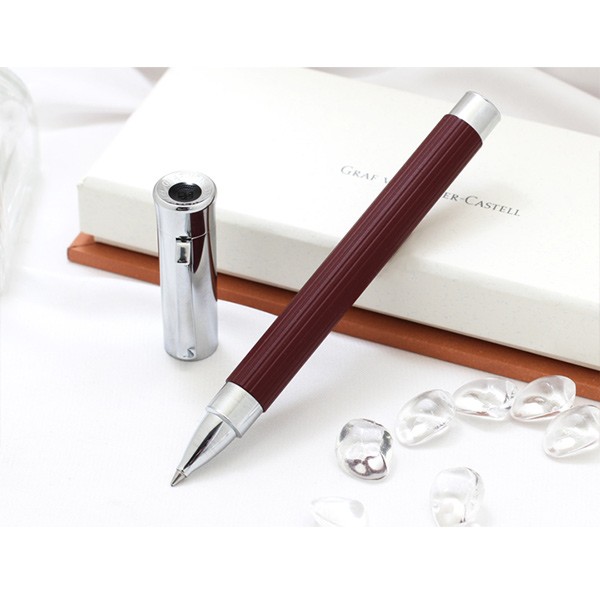 Ручка роллер "Tamitio Marsala" немецкой марки "Graf von Faber-Castell" является выражением чистой элегантности. Рифленый корпус сделан из металла с поэтапной полировкой. Инновационный лак, созданный специально для "Tamitio" (эта серия известна также как "Initio"), нанесенный в несколько слоёв, придает корпусу ручки долговечный, благородный, матовый облик. Цвет лака - бордовый ("марсала"). Кроме того ручку украшают высококачественные полированные передние и торцевые элементы и тонкая гравированная печать "Handmade in Germany" ("Сделано вручную в Германии"). Роллер оснащен качественным пишущим узлом, который плавно скользит по бумаге, а также стержнем увеличенного объема.