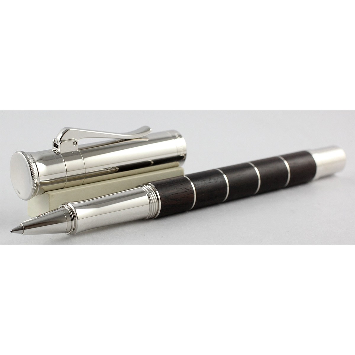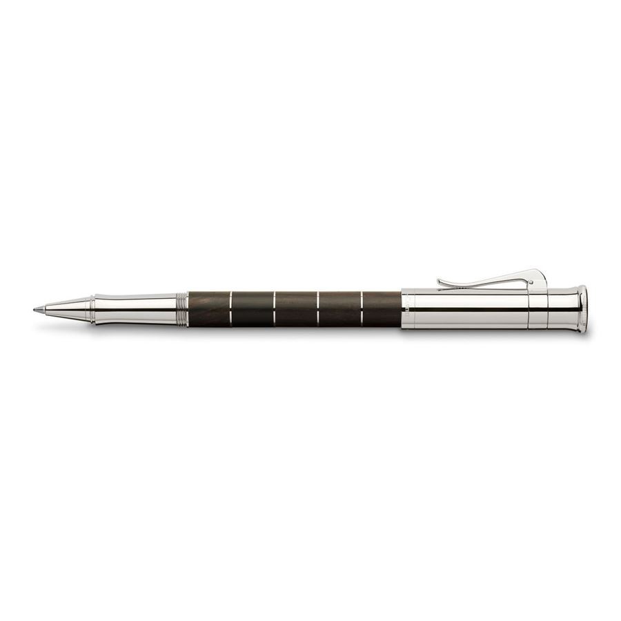 Ручка роллер "Classic Anello Grenadill" ("Grenadilla") немецкой марки "Graf von Faber-Castell" объединяет в себе естественное и теплое обаяние древесины с элегантностью прохладного платинового блеска деталей и декоративных колец ("Anello" - итал. "Кольцо"). Корпус сделан из разделенных кольцами сегментов драгоценной темно-коричневой гренадиловой древесины ("африканского черного дерева"). Эта древесина - очень плотная и прочная. Акустические свойства гренадила особенно ценятся при изготовлении духовых музыкальных инструментов, в основном кларнетов, гобоев и волынок. Природные различия в текстуре и цвете древесины делают каждую ручку "Classic Grenadill" уникальной. Помимо колец ручку украшают покрытые платиной передние и торцевые элементы и тонкая гравированная печать "Handmade in Germany" ("Сделано вручную в Германии"). Ручка-роллер оснащена качественным пишущим узлом, который плавно скользит по бумаге. Колпачок - завинчивающийся. Тугой зажим на колпачке имеет пружинную систему.