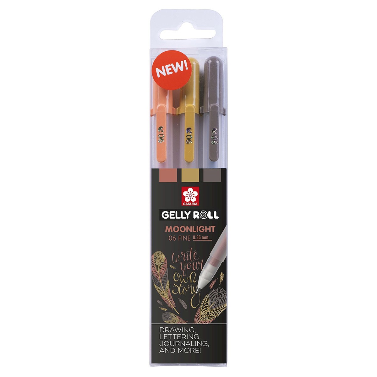 Гелевые ручки впервые появились в 1984 году благодаря японской компании "Sakura". С тех пор компания-первооткрыватель постоянно совершенствовала свое изобретение. Гелевые ручки "Moonlight 06" серии "Gelly Roll" от "Sakura" это - результат многолетнего поиска идеальных гелевых чернил и идеальных пишущих узлов. Ручки "Gelly Roll Moonlight 06" имеют в пишущем узле шарик 0.6мм, дающий линию 0.35мм. Ручки прекрасно пишут и удобно лежат в руке. Чернила обладают высокой кроющей способностью, водостойкостью, химической стабильностью и устойчивостью к выцветанию. Гелевые ручки "Gelly Roll Moonlight" отличаются красивыми оттенками. Эти ручки хороши для создания декоративных работ и на светлом, и, особенно, на темном фоне. Они подходят не только для бумаги, но и для твердых гладких поверхностей, наподобие стекла и пластика. Хранить ручки рекомендуется в горизонтальном положении с закрытым колпачком. В набор входят 3 ручки следующих цветов: 412 Коричневый бледный, 415 Охра желтая, 417 Коричневый Ван-Дейк.