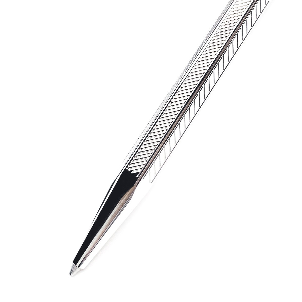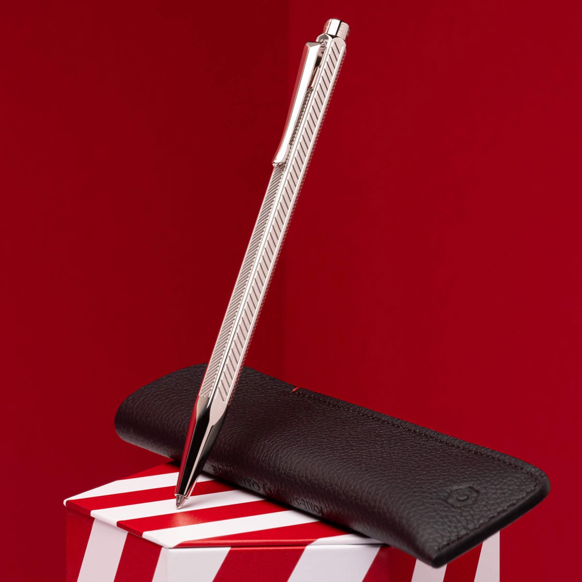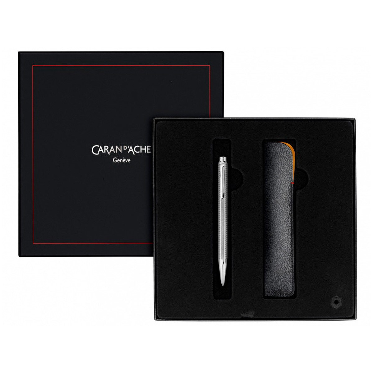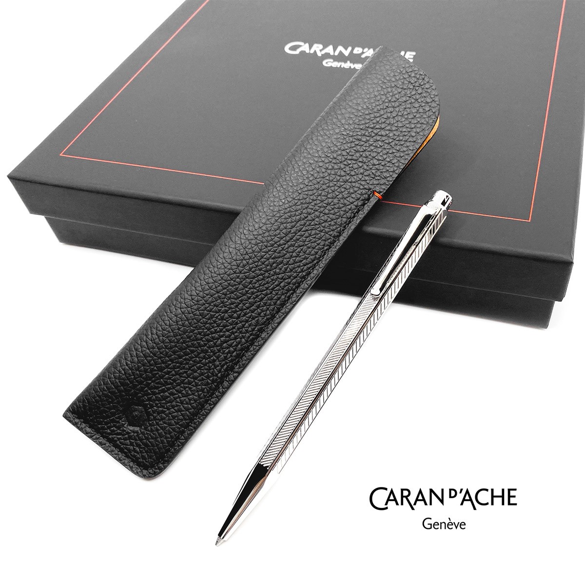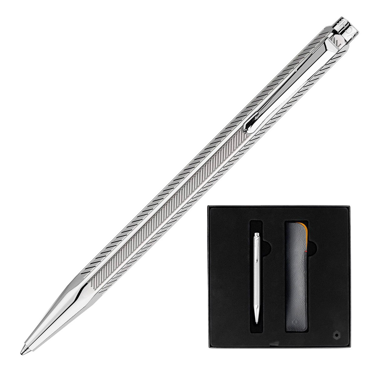 Шариковая ручка Caran d’Ache Milled Сhevron с гильшионированной отделкой корпуса поставляется в комплекте с черным коданным чехлом. Шестигранный корпус ручки, сделанный из ювелирной латуни, декорирован элегантным тонким узором "шеврон", покрыт палладием, и отполирован до блеска. Гладкие элементы так же покрыты блестящим палладием и украшены выгравированными логотипами Caran d’Ache. Стержень - Caran d'Ache M Blue Goliath (черные чернила, хватает на 600 страниц A4). Черная подарочная коробка делает этот набор из ручки и футляра отличным подарком.