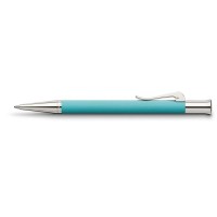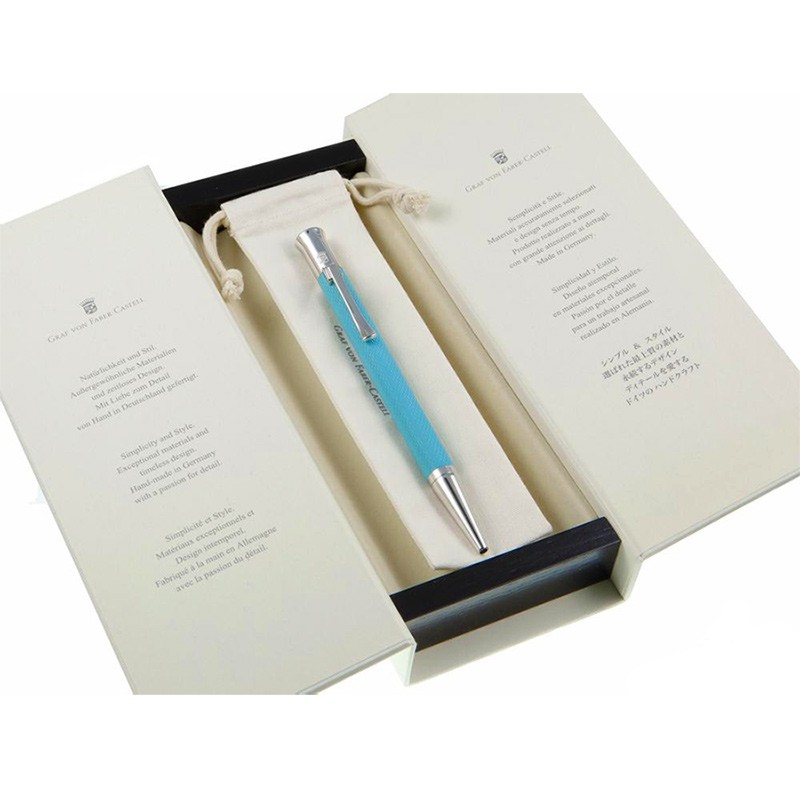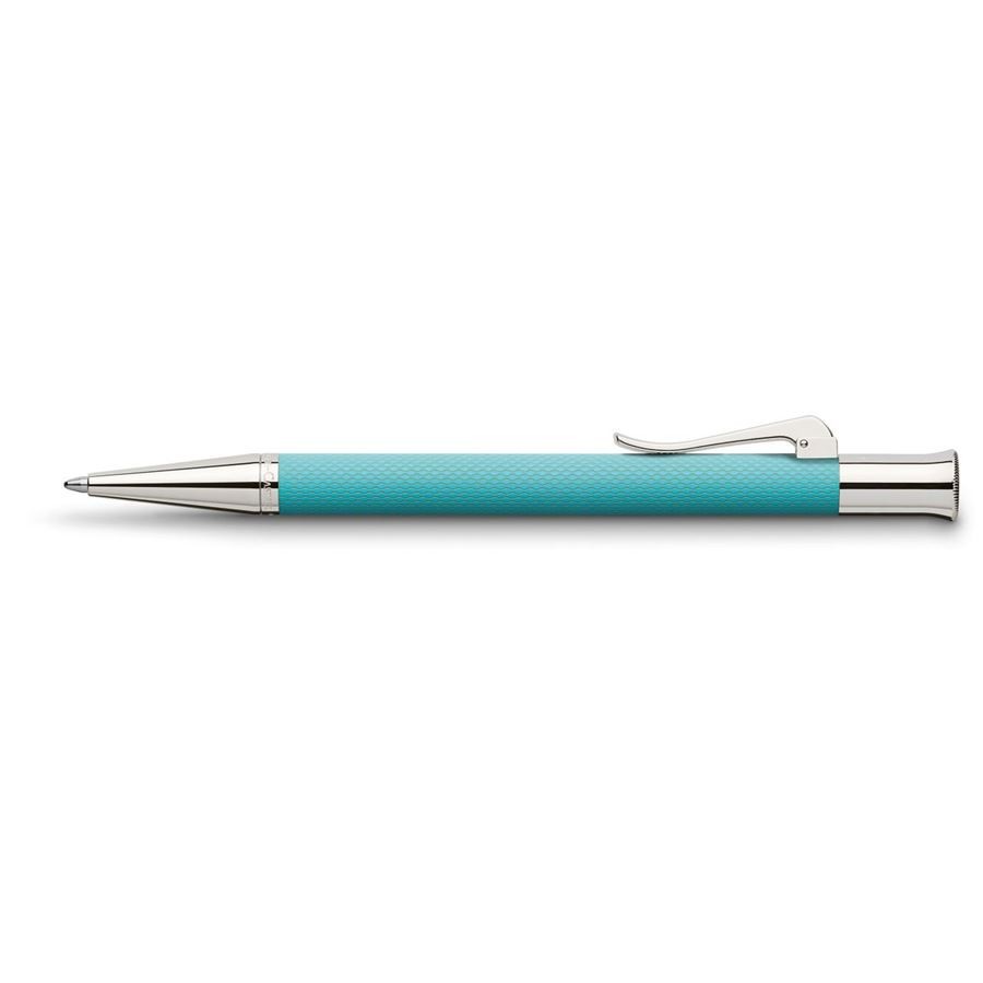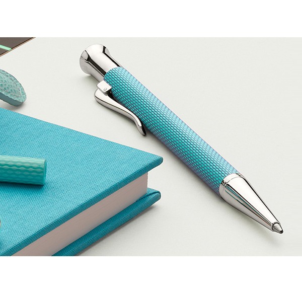 Шариковая ручка бирюзового цвета "Guilloche Turquoise" немецкой марки "Graf von Faber-Castell" выполнена из драгоценной смолы, декорированной в технике "гильош" ("guilloche"), используемой ювелирами при обработке драгоценных металлов. Для создания этой ручки её корпус вручную многократно покрывался смолистым лаком, с последующей сушкой и полировкой каждого слоя. После чего вручную наносилась гравировка. В результате любая из ручек серии "Guilloche" является штучной работой, хранящей тепло человеческих рук, - уникальной структурой с индивидуальным орнаментом. Помимо тонкой гравировки ручку украшают покрытые родием передние и торцевые элементы, и тонкая гравированная печать "Handmade in Germany" ("Сделано вручную в Германии"). Шариковая ручка оснащена качественным пишущим узлом, который плавно скользит по бумаге. Механизм выдвижения стержня - поворотный. Тугой зажим имеет пружинную систему.