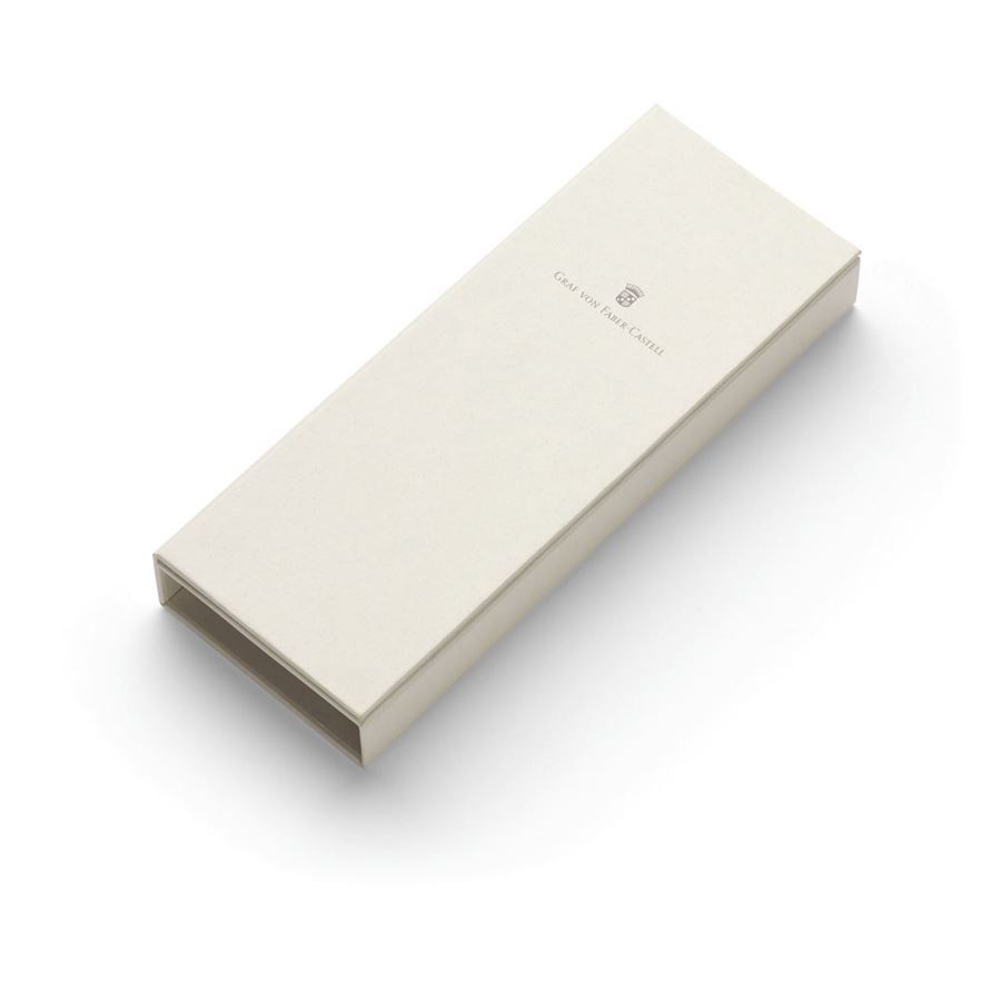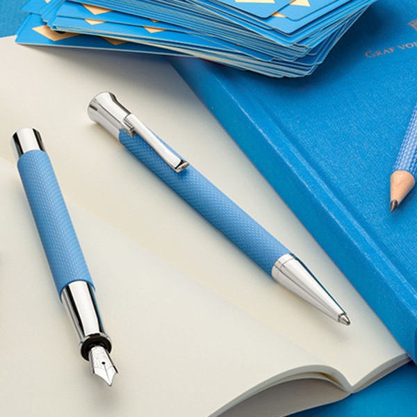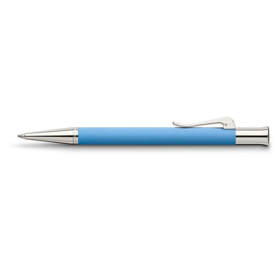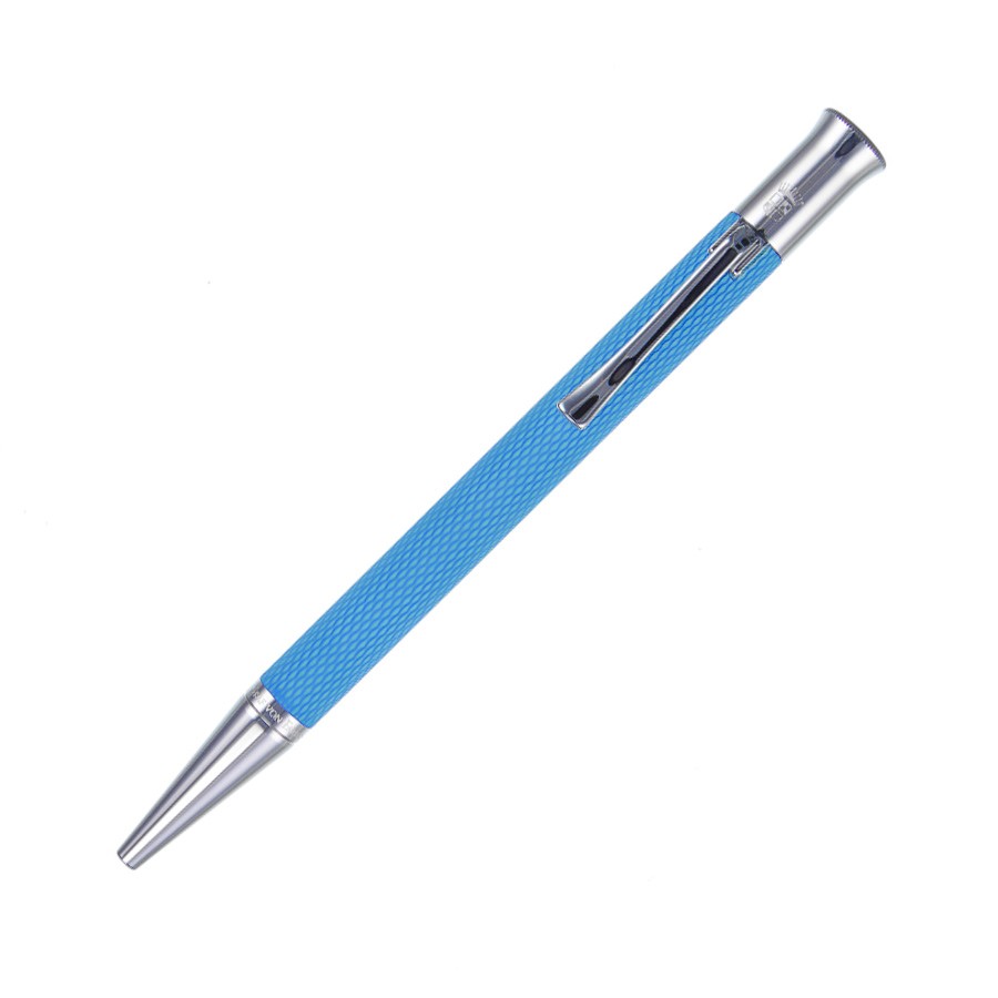 Шариковая ручка синего цвета "Guilloche Gulf Blue" немецкой марки "Graf von Faber-Castell" выполнена из драгоценной смолы, декорированной в технике "гильош" ("guilloche"), используемой ювелирами при обработке драгоценных металлов. Для создания этой ручки её корпус вручную многократно покрывался смолистым лаком, с последующей сушкой и полировкой каждого слоя. После чего вручную наносилась гравировка. В результате любая из ручек серии "Guilloche" является штучной работой, хранящей тепло человеческих рук, - уникальной структурой с индивидуальным орнаментом. Помимо тонкой гравировки ручку украшают покрытые родием передние и торцевые элементы, и тонкая гравированная печать "Handmade in Germany" ("Сделано вручную в Германии"). Шариковая ручка оснащена качественным пишущим узлом, который плавно скользит по бумаге. Механизм выдвижения стержня - поворотный. Тугой зажим имеет пружинную систему.