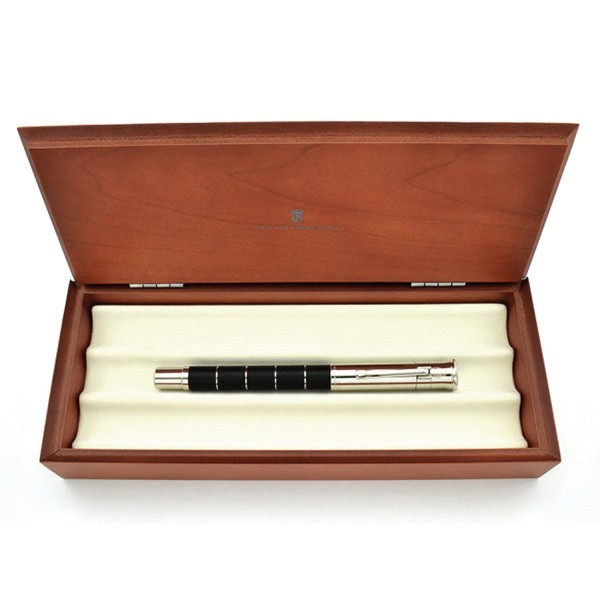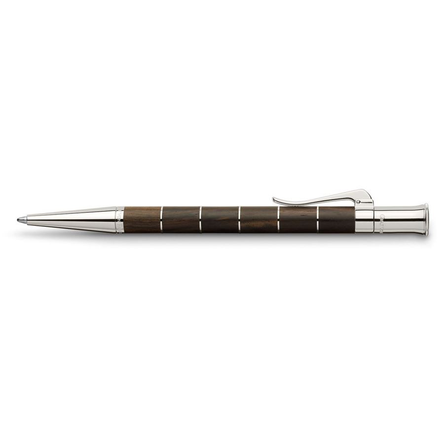 Шариковая ручка "Classic Anello Grenadill" ("Grenadilla") немецкой марки "Graf von Faber-Castell" объединяет в себе естественное и теплое обаяние древесины с элегантностью прохладного платинового блеска деталей и декоративных колец ("Anello" - итал. "Кольцо"). Корпус сделан из разделенных кольцами сегментов драгоценной темно-коричневой гренадиловой древесины ("африканского черного дерева"). Эта древесина - очень плотная и прочная. Акустические свойства гренадила особенно ценятся при изготовлении духовых музыкальных инструментов, в основном кларнетов, гобоев и волынок. Природные различия в текстуре и цвете древесины делают каждую ручку "Classic Grenadill" уникальной. Помимо колец ручку украшают покрытые платиной передние и торцевые элементы и тонкая гравированная печать "Handmade in Germany" ("Сделано вручную в Германии"). Шариковая ручка оснащена качественным пишущим узлом, который плавно скользит по бумаге. Механизм выдвижения стержня - поворотный. Тугой зажим имеет пружинную систему.