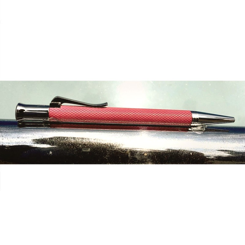 Шариковая ручка кораллового цвета "Guilloche Coral" немецкой марки "Graf von Faber-Castell" выполнена из драгоценной смолы, декорированной в технике "гильош" ("guilloche"), используемой ювелирами при обработке драгоценных металлов. Для создания этой ручки её корпус вручную многократно покрывался смолистым лаком, с последующей сушкой и полировкой каждого слоя. После чего вручную наносилась гравировка. В результате любая из ручек серии "Guilloche" является штучной работой, хранящей тепло человеческих рук, - уникальной структурой с индивидуальным орнаментом. Помимо тонкой гравировки ручку украшают покрытые родием передние и торцевые элементы, и тонкая гравированная печать "Handmade in Germany" ("Сделано вручную в Германии"). Шариковая ручка оснащена качественным пишущим узлом, который плавно скользит по бумаге. Механизм выдвижения стержня - поворотный. Тугой зажим имеет пружинную систему.
