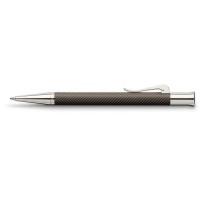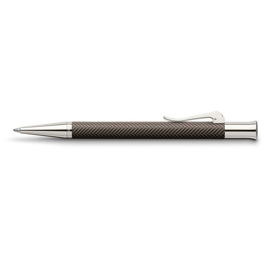 Шариковая ручка коричневого цвета "Guilloche Cisele Brown" немецкой марки "Graf von Faber-Castell" выполнена из драгоценной смолы, декорированной рисунком-"ёлочкой" в технике "гильош" ("guilloche"), используемой ювелирами при обработке драгоценных металлов. Для создания этой ручки её корпус вручную многократно покрывался смолистым лаком, с последующей сушкой и полировкой каждого слоя. После чего вручную наносилась гравировка. В результате любая из ручек серии "Guilloche" является штучной работой, хранящей тепло человеческих рук, - уникальной структурой с индивидуальным орнаментом. Помимо тонкой гравировки ручку украшают покрытые родием передние и торцевые элементы, и тонкая гравированная печать "Handmade in Germany" ("Сделано вручную в Германии"). Шариковая ручка оснащена качественным пишущим узлом, который плавно скользит по бумаге. Механизм выдвижения стержня - поворотный. Тугой зажим имеет пружинную систему.