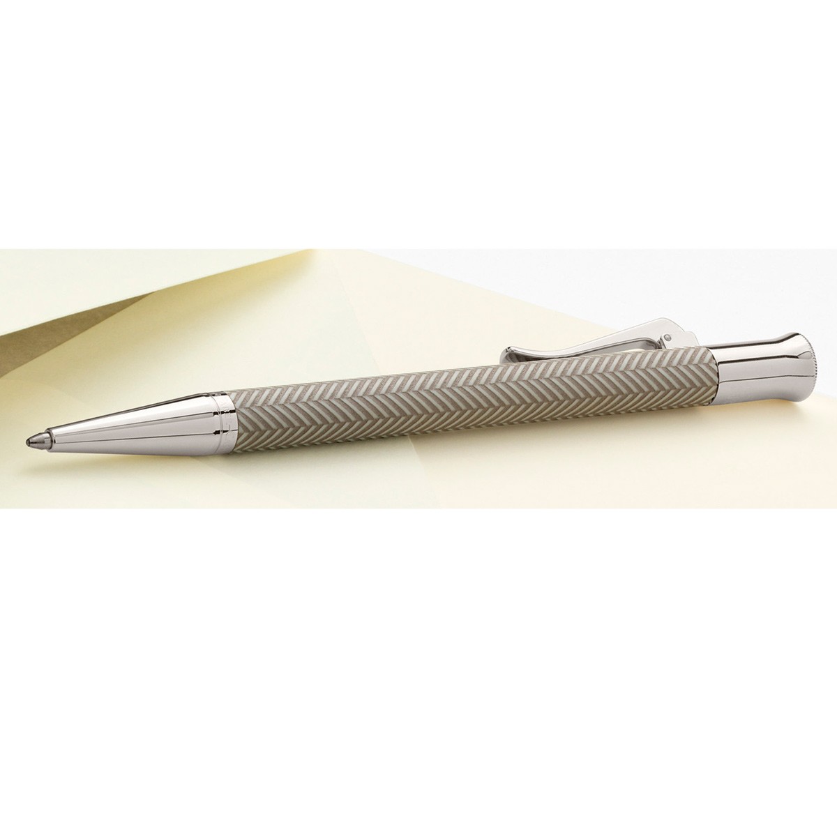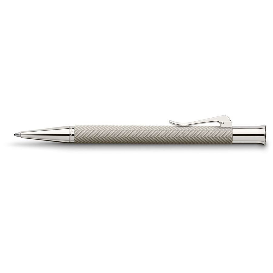 Шариковая ручка светло-серого цвета "Guilloche Cisele Light Grey" немецкой марки "Graf von Faber-Castell" выполнена из драгоценной смолы, декорированной рисунком-"ёлочкой" в технике "гильош" ("guilloche"), используемой ювелирами при обработке драгоценных металлов. Для создания этой ручки её корпус вручную многократно покрывался смолистым лаком, с последующей сушкой и полировкой каждого слоя. После чего вручную наносилась гравировка. В результате любая из ручек серии "Guilloche" является штучной работой, хранящей тепло человеческих рук, - уникальной структурой с индивидуальным орнаментом. Помимо тонкой гравировки ручку украшают покрытые родием передние и торцевые элементы, и тонкая гравированная печать "Handmade in Germany" ("Сделано вручную в Германии"). Шариковая ручка оснащена качественным пишущим узлом, который плавно скользит по бумаге. Механизм выдвижения стержня - поворотный. Тугой зажим имеет пружинную систему.