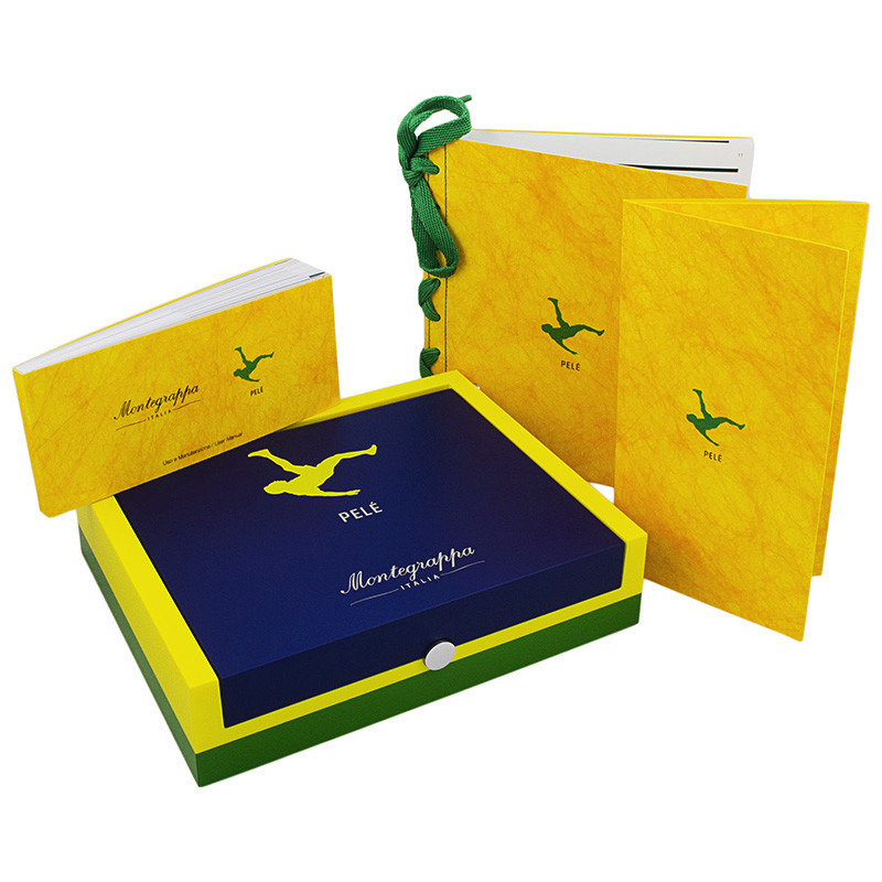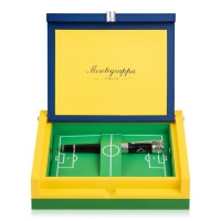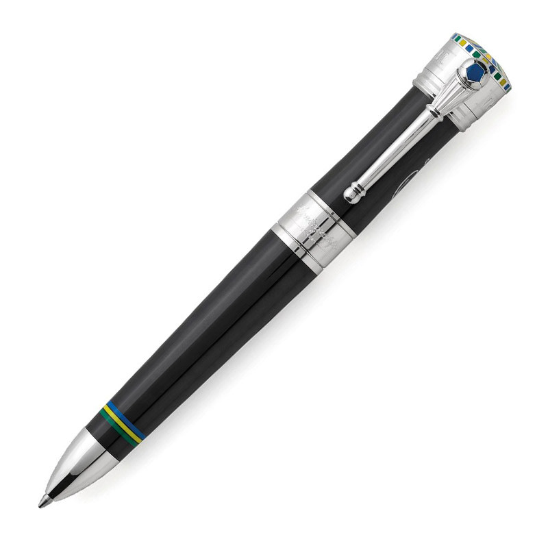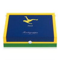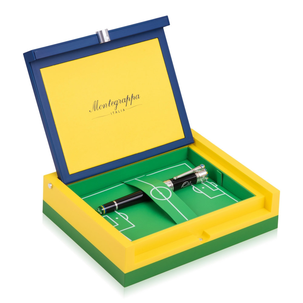 Ручка шариковая "Пеле P10" из лимитированной серии от Montegrappa. Эта модель изготовлена из черной смолы с отделкой из серебра. Основой для декора верхней части был выбран стадион «Маракана» в Рио-де-Жанейро, а цвета бразильского флага воспроизведены при помощи эмали. Корпус ручки, в зоне захвата, так же декорирован ободками синего, зеленого и желтого цветов. Зажим ручки «Р10» решен в виде королевского скипетра, символизируя образ «короля футбола», и украшен миниатюрным футбольным мячом, инкрустированным сапфиром. Выгравированная надпись "The King of Football" (англ. "Король футбола") опоясывает колпачок, а подпись Пеле в белом цвете изображена на его боковой части. На конце корпуса методом гравировки нанесен серийный номер, подтверждающий то, что перед вами одна из ручек модели «Р10», всего которых было выпущено по 1940 экземпляров перьевых ручек, роллеров и шариковых авторучек в честь года рождения Пеле.